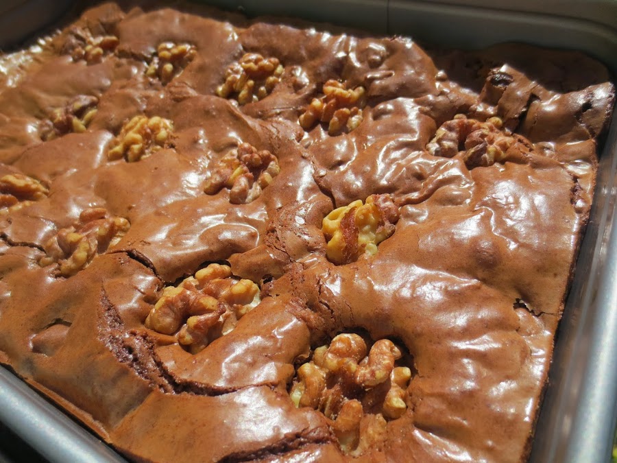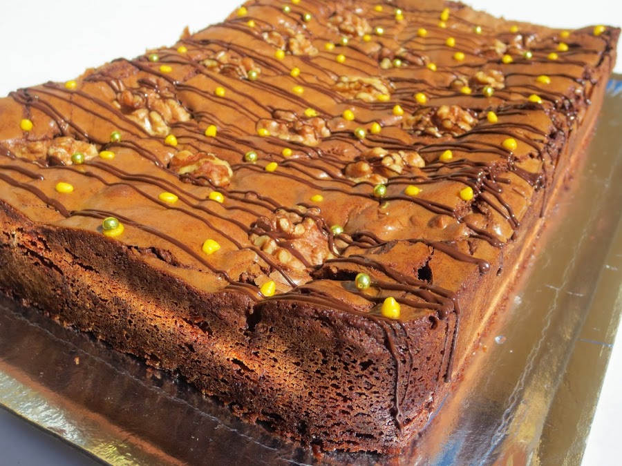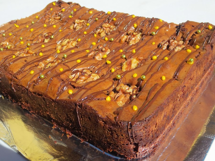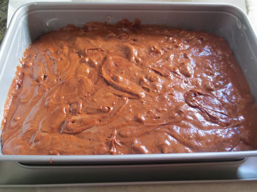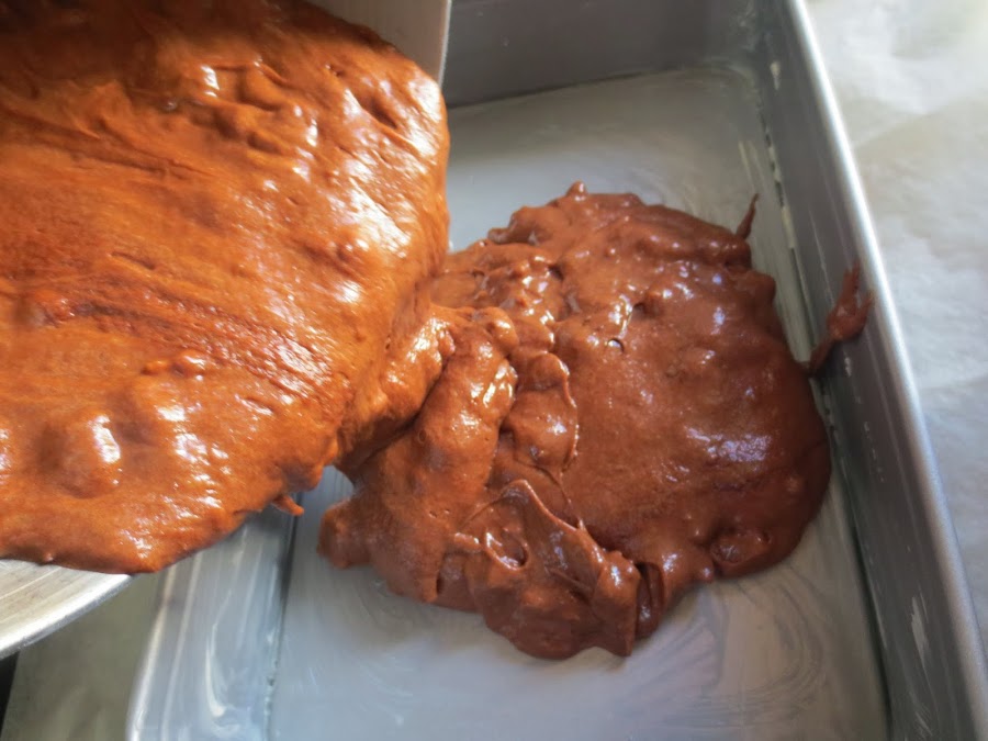 6- Verter la mezcla en un molde desmontable de 24 x 24 o uno redondo de 23 cm de diámetro, o rectangular 28x18 cm, bien engrasado (enharinar si no es anti-adherente). Hornear 35 minutos. Apagar el horno y dejarlo dentro otros 10-15 minutos para que se termine de hacer y no se queme el chocolate. Dejar enfriar.