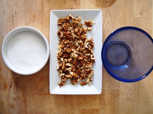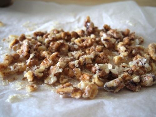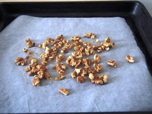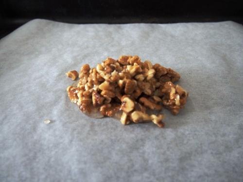 Dispondremos en la placa del horno un papel mantequilla (papel sulforizado) y verteremos las nueces lo mas separadas unas de otras.
