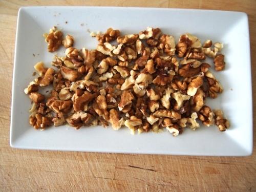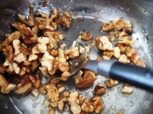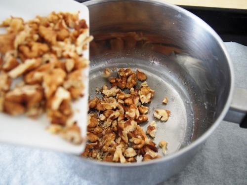 Incorporar en la cacerola los 15 gr de agua mas el azúcar. En la primera ebullición añadiremos las nueces picadas y retiramos del fuego.