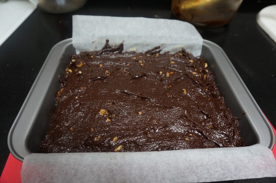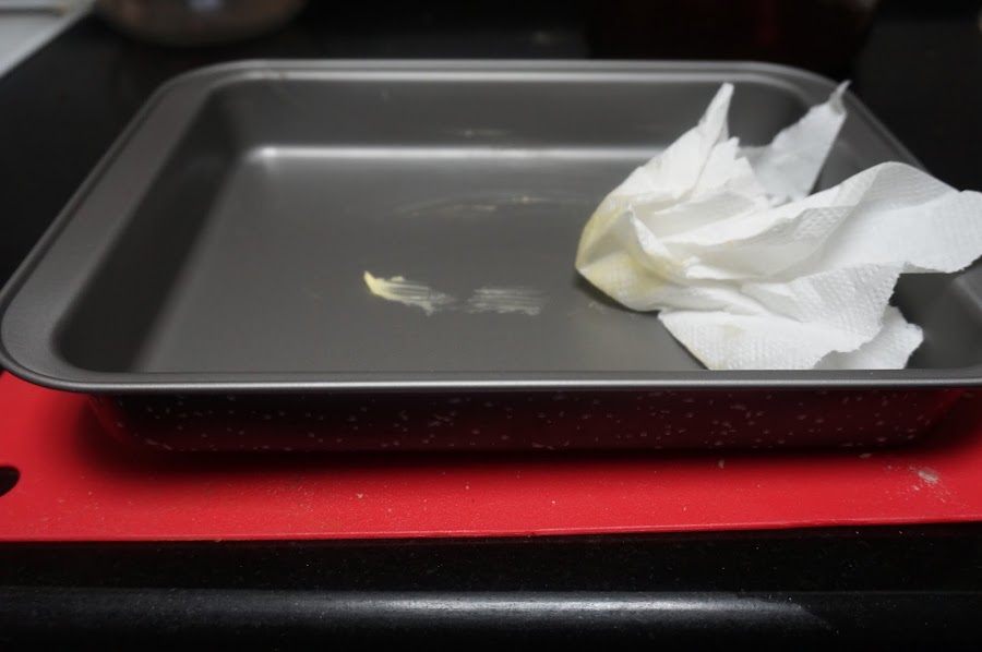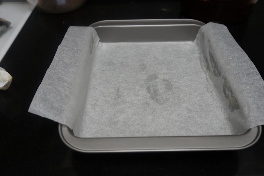Ponemos el horno a calentar a 170ºC. Engrasamos un molde cuadrado con mantequilla. Y ponemos papel de horno, que sobresalga por los laterales.