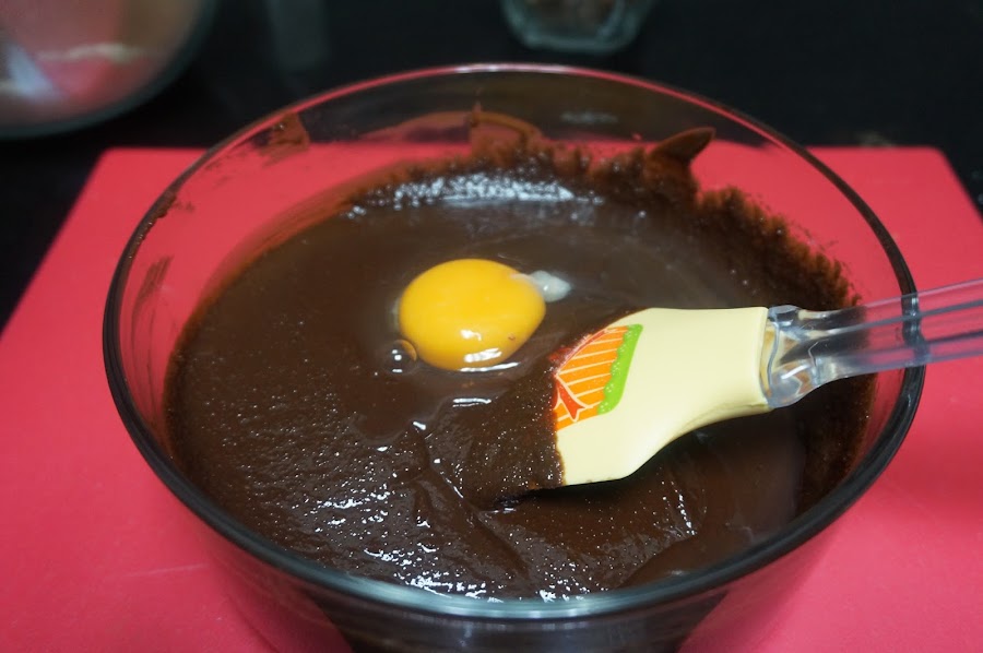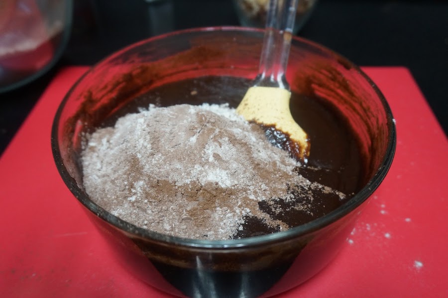 Incorporamos la mezcla de harina y el cacao, mezclamos bien.