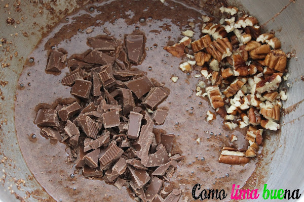 Añadimos a la mezcla los trozos de chocolate y las pecanas picadas.