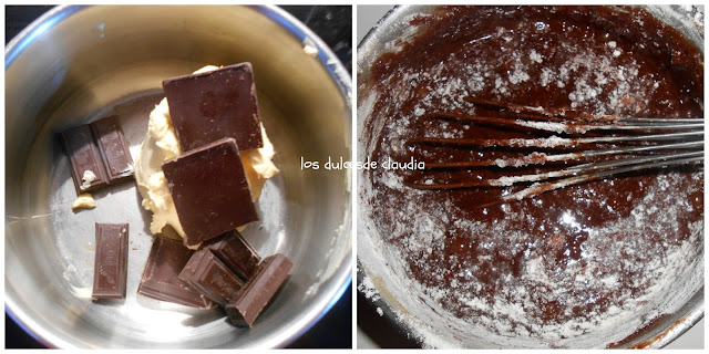 Poner en una olla al fuego el chocolate troceado con la mantequilla, cuando se hayan fundido retirar y añadimos el cacao, integrar bien.