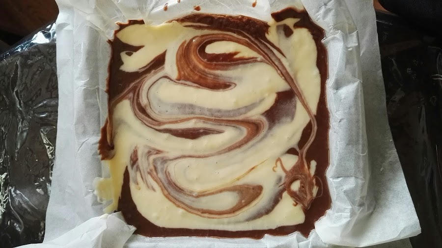 Vetemos la mezcla del cheesecake sobre la mezcla de los brownies y con la ayuda de un cuchillo o cucharita hacemos movimientos horizontales para marmolearlo un poco
