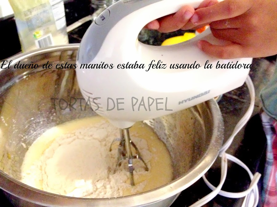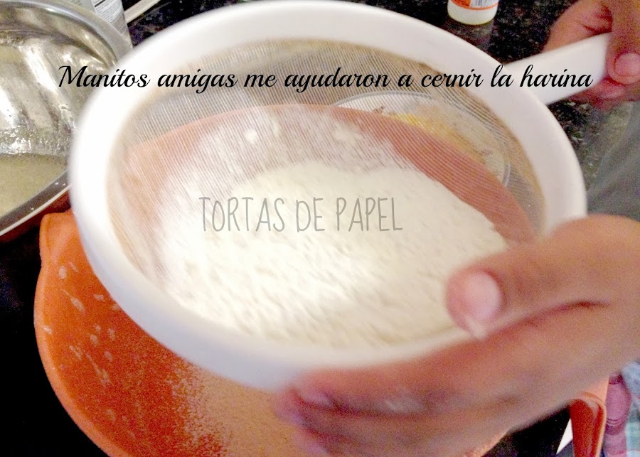 El siguiente paso es cernir la harina antes de mezclarla con el liquido que tenemos de los huevos y el azúcar. este paso le encanto a mi ayudante mayor si pueden ver en la fotografía esas son sus manitas y se hubiesen visto su carita, totalmente orgullo de hacerlo él.