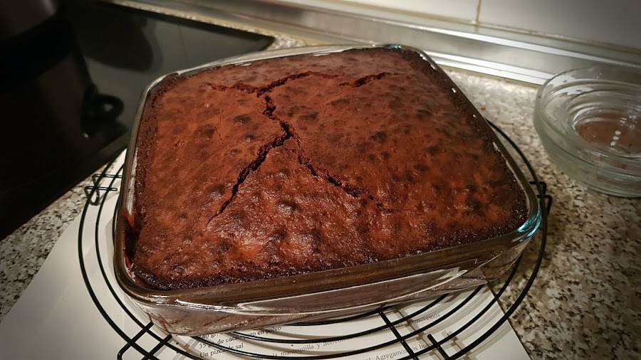 4. Rociamos el molde o moldes a utilizar con espray desmoldante y vertemos la mezcla en él o ellos. Yo preferí hacer un único brownie (que en realidad fueron dos).