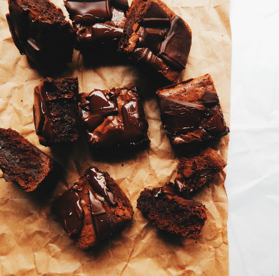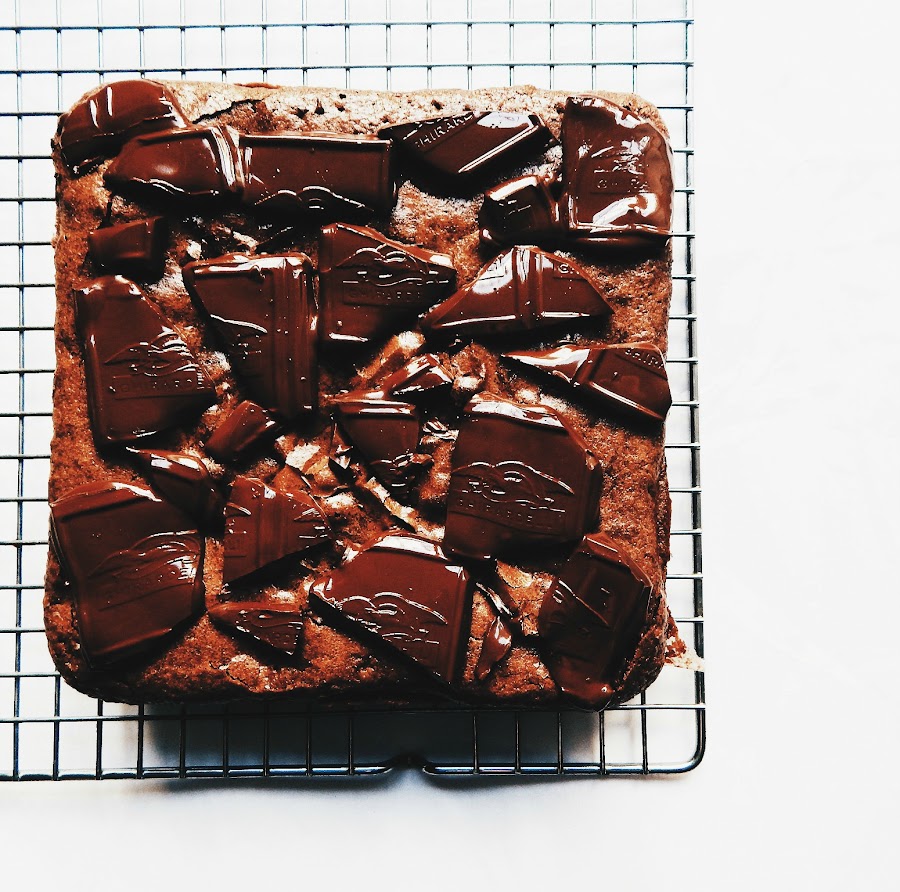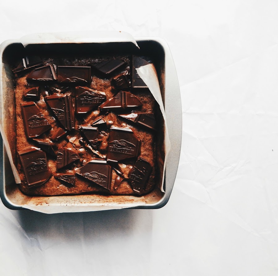 Miré en la cuenta de instagram de food 52 un sorteo en colaboración con la marca de chocolates Ghirardelli. El ganador se llevaría un paquete de Ghirardelli con un valor de 200 dólares. Sólo tenía que hacer un postre, publicar la fotografía en mi instagram y seguir unos sencillos pasos. ¡Inmediatamente pensé en los brownies! Tenía una barra de chocolate girardelli y era perfecta para poner trozos de chocolate por encima.