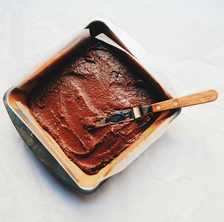 Precalentamos el horno a 340 °F (170 °C). Preparamos un molde cuadrado de 20 cm; engrasamos con mantequilla, cubrimos con papel encerado, volvemos a engrasar y espolvoreamos con cocoa. Quitamos bien el exceso.