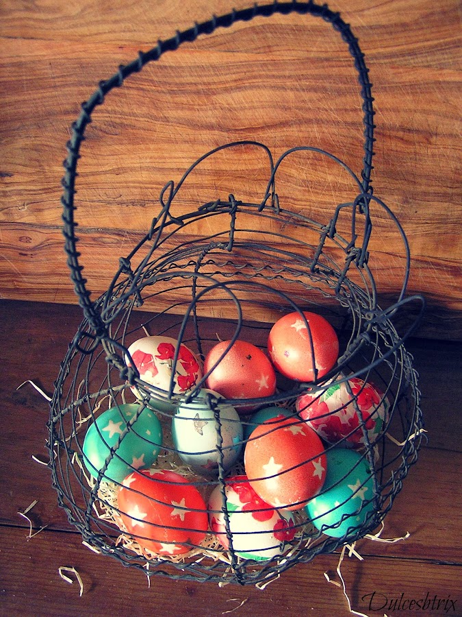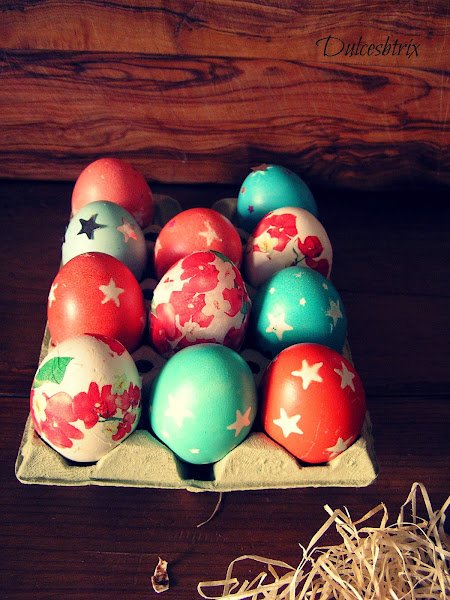 Puedes ver el paso a paso para preparar los huevos en este blog, aqui la decoración. con servilletas y aqui la de pintura con pegatinas.