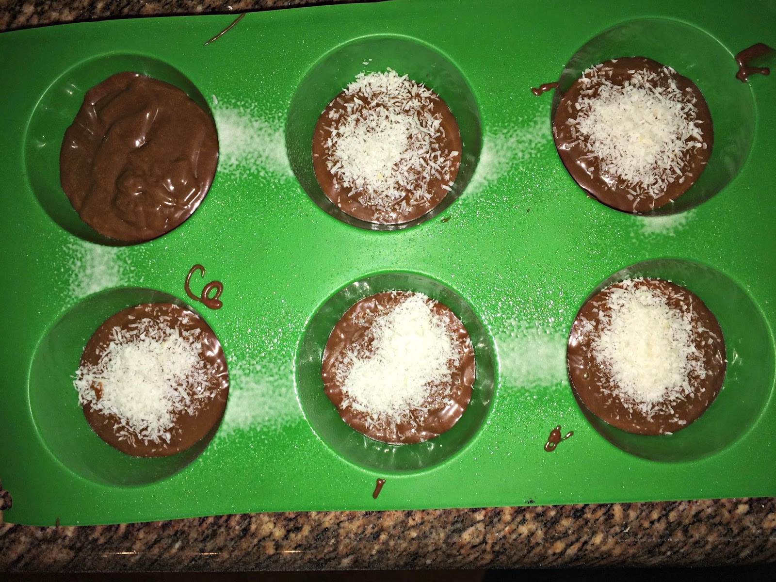 Cuando esté totalmente incorporada la crema, añadiremos la harina que habremos tamizado con la levadura, si al final la ponemos, sobre la mezcla, y removeremos para que se mezcle y no queden grumos. En mi caso me apetecía hacerlos con coco, así que añadí la mitad de la masa, puse un poco de coco rallado y terminé de cubrir con el resto de la masa. También podéis ponerle trocitos de avellana en la superficie, al gusto.