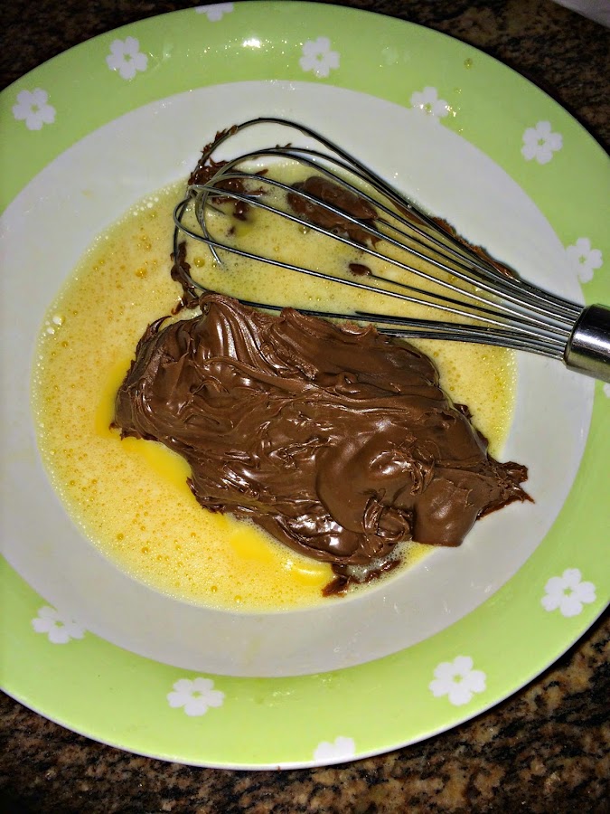 En un bol batimos los huevos hasta que estén espumosos, a continuación añadiremos la crema de avellanas y removemos bien hasta que se mezclen por completo.