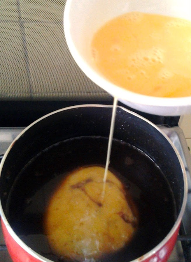 en un recipiente batiremos los huevos y los agregaremos a la preparación en forma de hilo , sin dejar de remover para evitar que se coagulen (en la foto verán que no estoy removiendo mientras los agrego pero es que no tenia quien me tome la foto , de todas formas no se me coagularon porque mi mezcla ya estaba fría, jijiji )