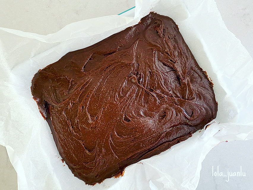 Colocamos la mantequilla en un cazo que ponemos al fuego hasta que la mantequilla esté derretida. Mientras, tamizamos la harina junto con el cacao y la levadura introduciéndolos en un bol grande. Añadimos el resto de los ingredientes en orden en el cuenco. Mezclamos con unas varillas hasta obtener una masa homogénea. Lo podemos hacer con ayuda de un procesador de alimentos.