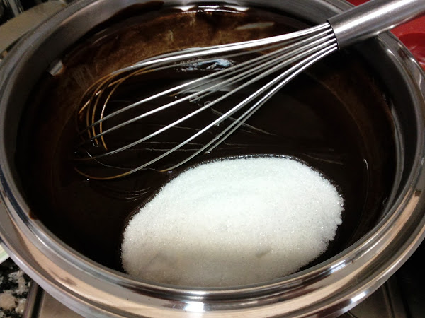 Ahora añadimos el azúcar y mezclamos hasta que se disuelva bien el azúcar, si es necesario, calentar un poco más al baño maría.