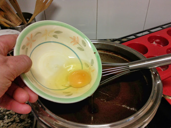 Añadimos los huevos uno a uno incorporando bien cada uno antes de añadir el siguiente, tener en cuenta que la mezcla no esté caliente para que no se nos cuajen los huevos.