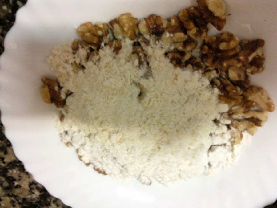 Mezclamos los frutos secos con la harina y aroma si vamos a usar alguno e incorporamos a la mezcla anterior.