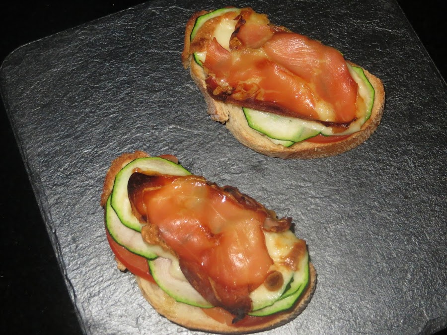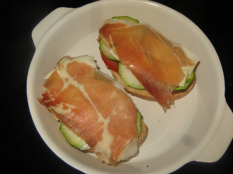 A continuación, colocamos el queso, es mejor que sea en lonchas ya que suelta menos agua, encimas las lonchas de calabacín que habremos cortado muy finas con un cuchillo o mandolina. Finalmente colocamos las lonchas de jamón que también tienen que ser finas y gratinamos en el horno. Cuando el jamón ha adquirido color y el queso se ha derretido están listas para servir.