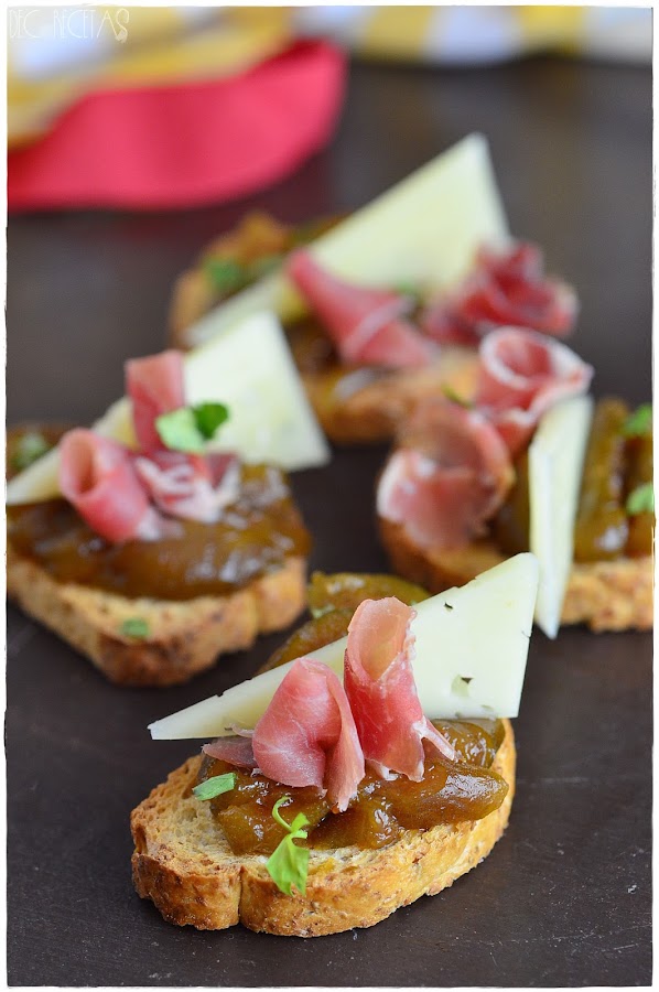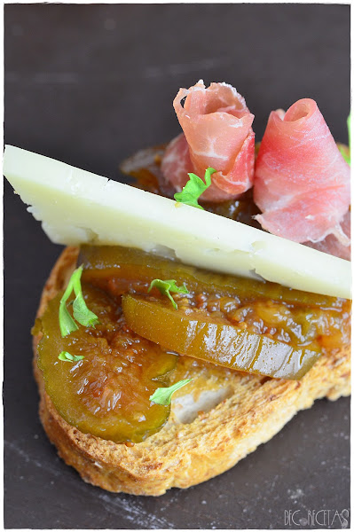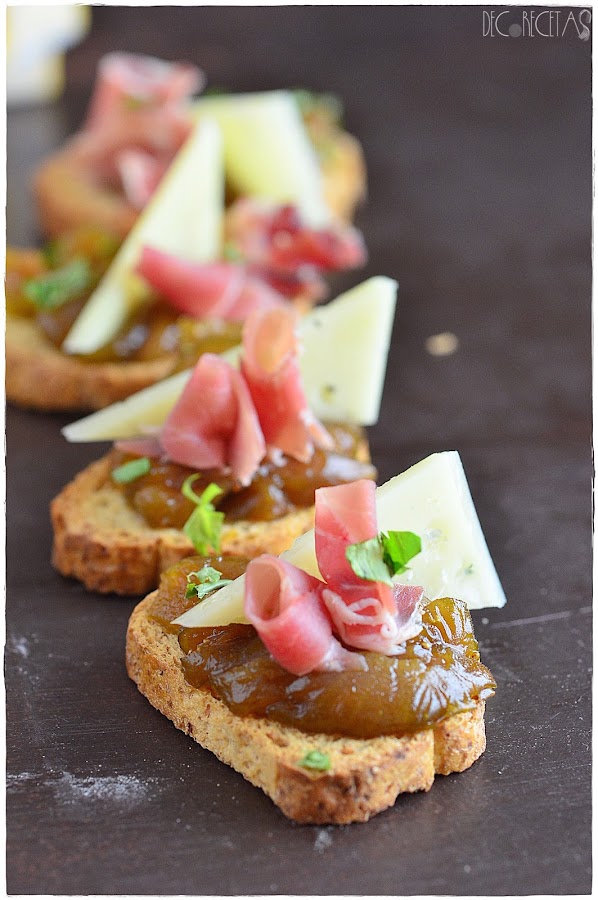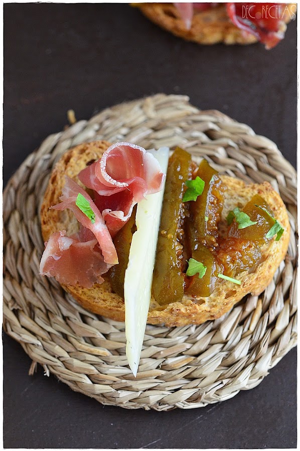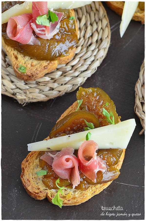 Como el título nos dice, se trata de poner encima de una rebanada de pan tostado, el higo en conserva , un rollito de jamón serrano y por último un triangulito de queso. Un aperitivo muy sencillo y muy sabroso