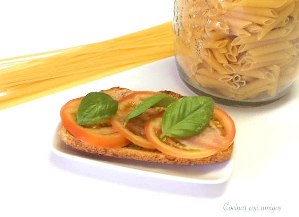 Estas bruschettas de tomate y albahaca me han parecido un sencillo entrante para acompañar a un buen plato de pasta, además es una receta sencilla y muy refrescante.