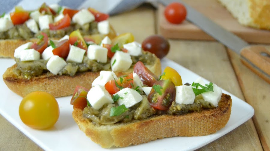 Las bruchettas son una receta típica del centro de Italia en la cual se utiliza pan tostado con ajo y aceite para servir sobre el gran cantidad de ingredientes a modo de aperitivo o pica-pica. existen multitud de mezclas posibles aunque uno de los ingredientes que no puede faltar es el queso. En esta ocasión además le añadimos una base de berenjena asada que le da un punto ¡Delicioso!