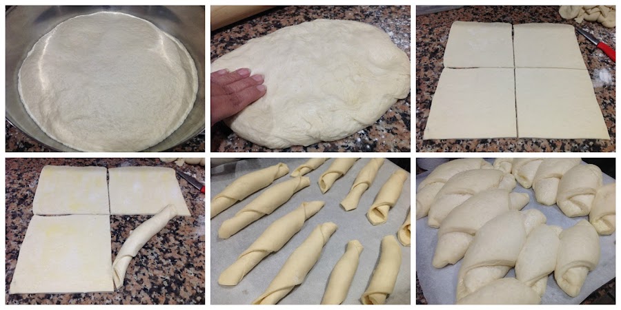Volcamos la masa en la encimera (mesada) enharinada y aplastamos con los dedos para quitar el exceso de gases que se generan con el fermento.Dvidimos la masa en dos y estiramos con rodillo dejándola de 0,5 cm de espesor. Derretimos las dos cucharadas de mantequilla. Con un cuchillo filosos cortamos cuadrados de 15x15 cm y pintamos cada uno con mantequilla y espolvoreamos con azúcar. Enrollamos desde una esquina a la otra y los ponemos sobre papel vegetal en una placa para horno. Dejamos leudar dutante 1 hora. (Me fui a hacer la compra y me olvidé de ellos, así que estuvieron fermentando durante dos horas, por eso el tamaño, jijiji.)