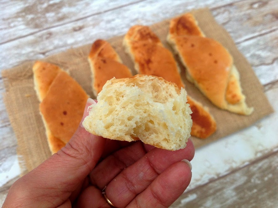 La receta la tomé prestada de este blog y la verdad es que me salieron diferentes, porque los dejé leudar mucho y quedaron más gorditos que los originales, pero exceptuando ese detalle, quedaron riquísimos y súperesponjosos, mmm...