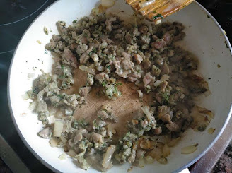 Cuando la cebolla transparente, añadimos la carne de cordero aliñada, los piñones y revolvemos un minuto.