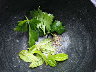 Por último, majamos ocho hojas de menta, 5 de perejil, 1/4 de semillas de comino y 1/2 cucharada de café de sal y la añadimos a la salsa.