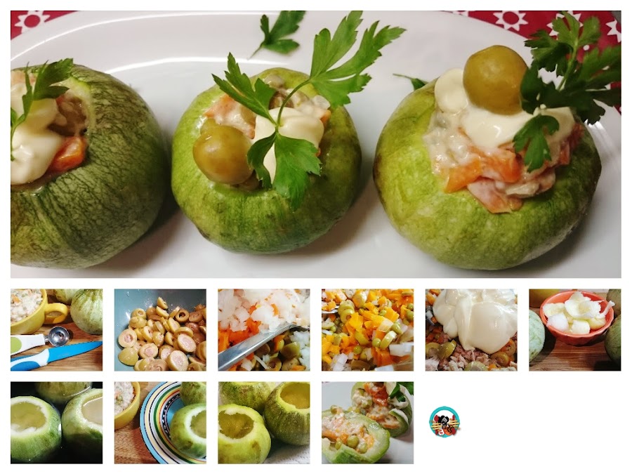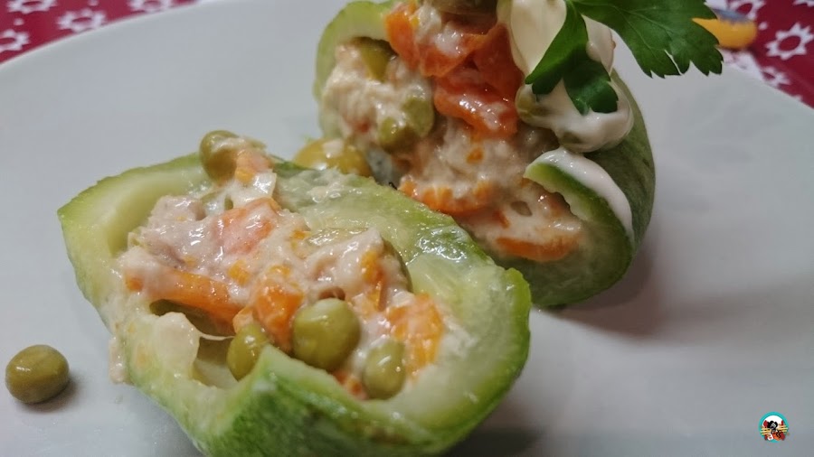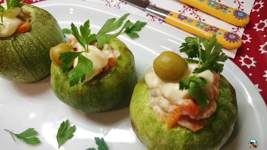 3.- Preparamos la ensalada; escurrimos las aceitunas y los guisantes. Picamos las aceitunas y dejamos 4 para decorar. mezclamos las aceitunas con la zanahoria y los guisantes. Escurrimos bien el atún y lo incorporamos, picamos la cebolla y la agregamos. Mezclamos la ensalada con la mahonesa y rellenamos los bubangos. Decoramos con una cucharada pequeña de mahonesa, una aceituna y unas ramitas de perejil fresco lavada. Servimos frío.