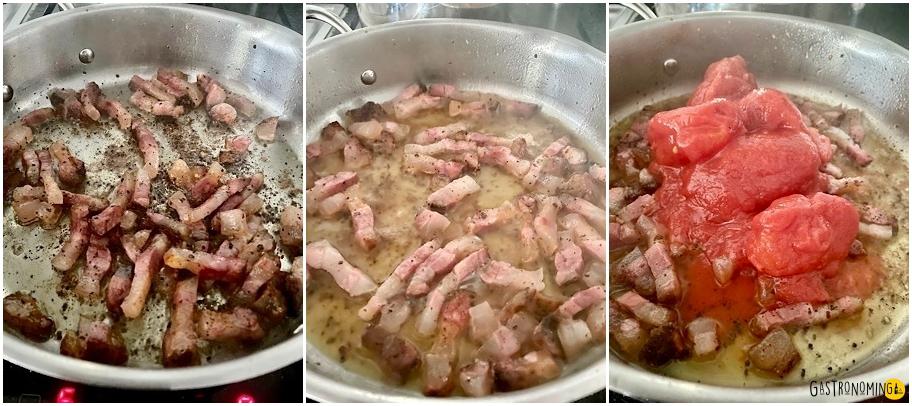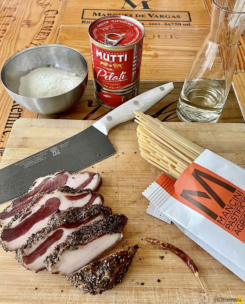 Pasta all´Amatriciana – Guanciale + tomates + vino blanco + pecorino + pimienta negra + peperoncini. Se consume con spaghetti, bucatini o tonnarelli