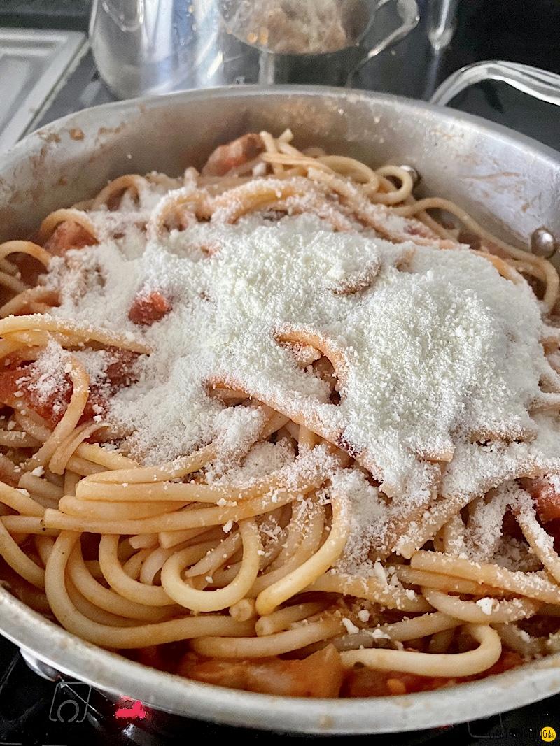 4. Agregamos la paste directamente de la cocción a nuestra amatriciana, no importa si cae agua de la cocción, de hecho, es mejor, movemos bien para que la pasta se “cargue” de salsa, rociamos queso, movemos una vez más y servimos inmediatamente, la amatriciana se sirve siempre bien caliente. Acompaña con más queso rallado fino. Si quieres víciate con el queso, ahora bien, se secará la pasta, tranquilo, para eso tienes el agua de la cocción de la pasta, andiamo con tutto!