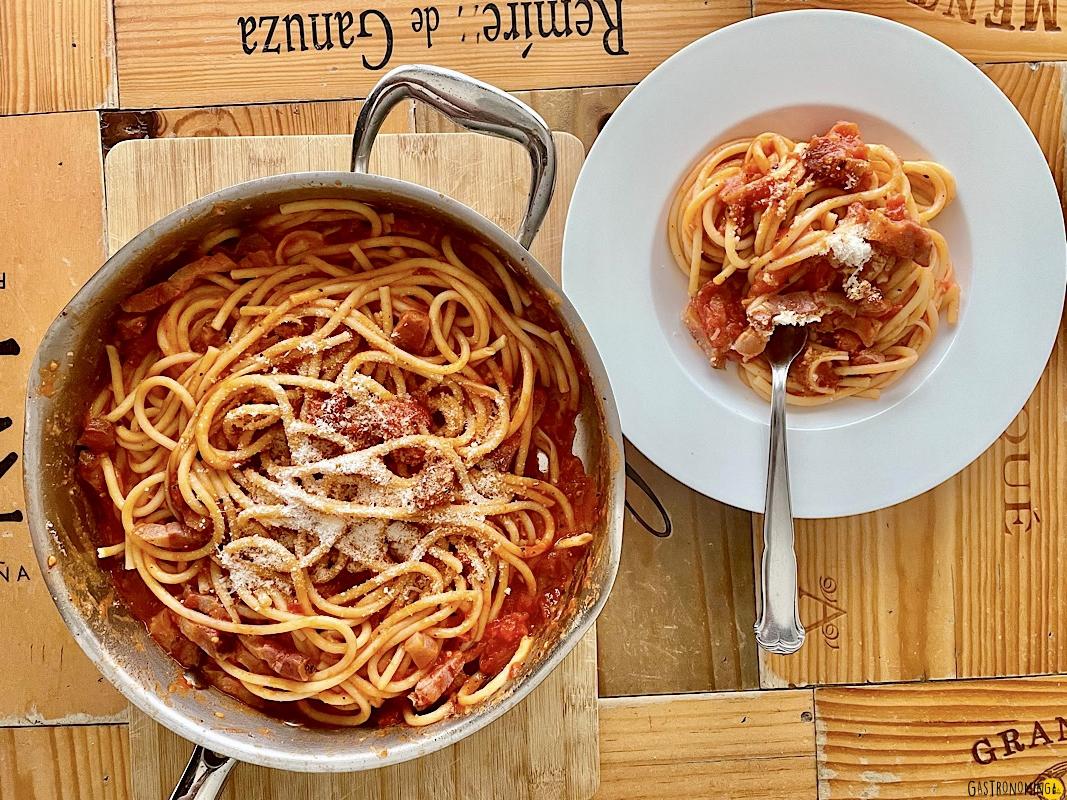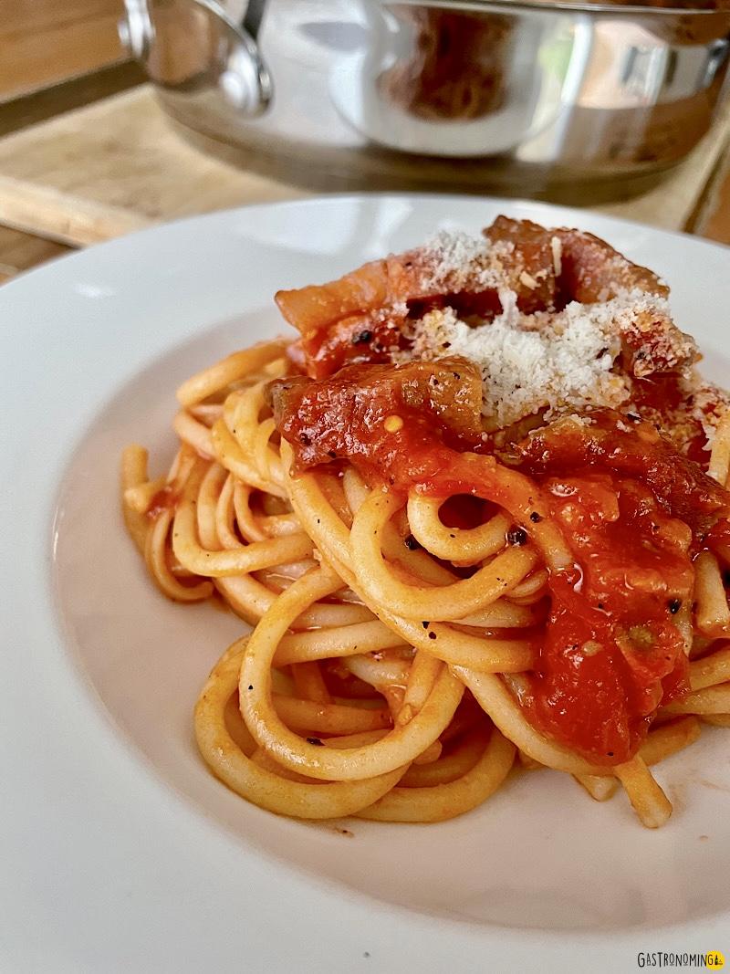 Bueno, dicho esto, entrando en materia de lo que es este plato, que por cierto, no necesita más de 20 minutos como mucho hacer esta maravilla. Tiene su origen en el pueblo de Amatrice, al norte de Lazio, de aquí toma su nombre y debe su nacimiento a los pastores locales que preparaban esta salsa con los productos de los que disponían y a la que llamaban “unto e cacio” algo así como “salsa y queso” para mojar sus trozos de pan seco. Se come como primer plato y originalmente solo se hacía con spaghetti y con el paso de los años, creció la costumbre de hacerlo con los rigatoni y más aún con los bucatini.