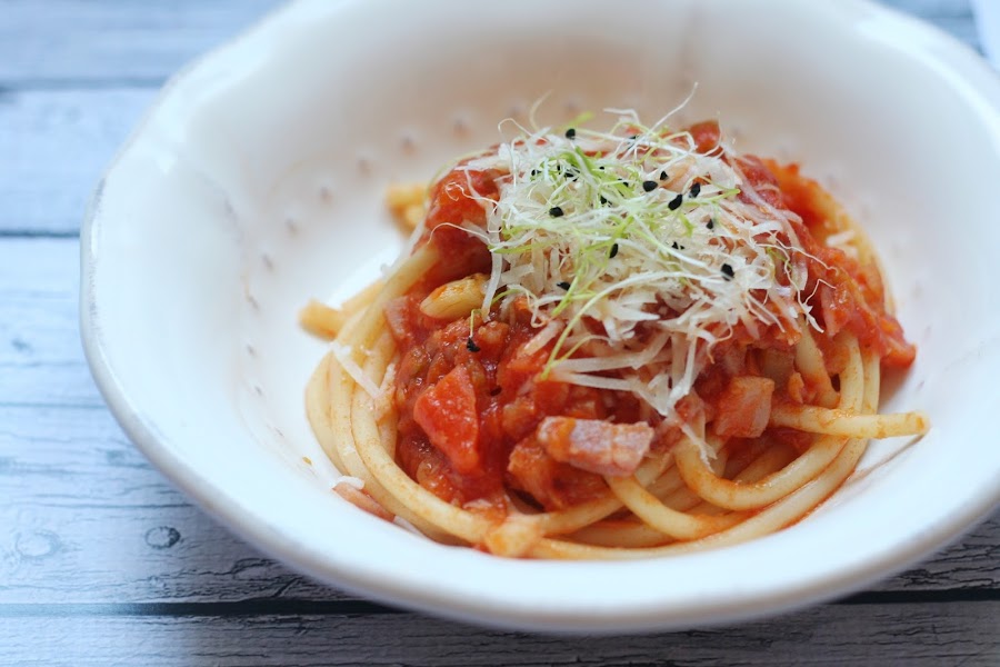 Aún así, si no encontráis bucatini, podéis usar cualquier otro tipo de pasta larga redonda, (la plana no me gusta con salsas de tomate) como capellini, bigoli o simplemente spaghetti.