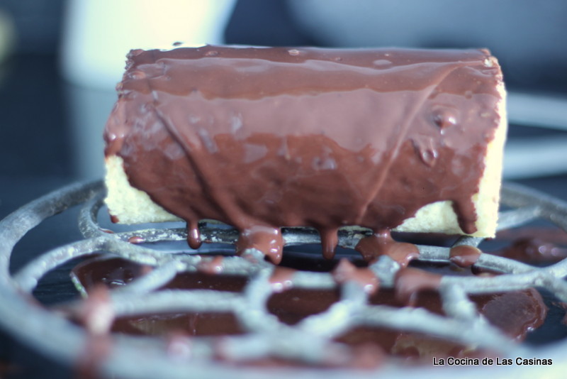 Retira el bizcocho del congelador, divide en dos. Coloca cada parte en una rejilla sobre un plato o similar y glasea. No te preocupes no vas a perder nada del glaseado ya que puedes aprovechar lo que ha caído en el plato, si te sobra, puedes congelarlo. Reserva en la nevera. Vamos a por los tronquitos, calienta en el micro el chocolate con la nata (crema de leche), una vez deshecho extiendes sobre papel vegetal, introduces en el congelador. Cuando esté frío no duro, retira con la espátula o con la hoja de un cuchillo en horizontal, se irán formando los tronquitos.