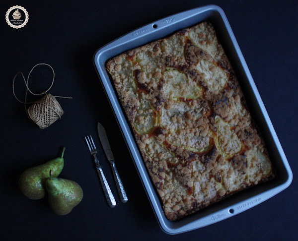 Desmenuzar el streusel sobre la masa y las peras, y llevar al horno unos 50-60 minutos, o hasta que al pinchar con una brocheta en el medio, ésta salga totalmente limpia.