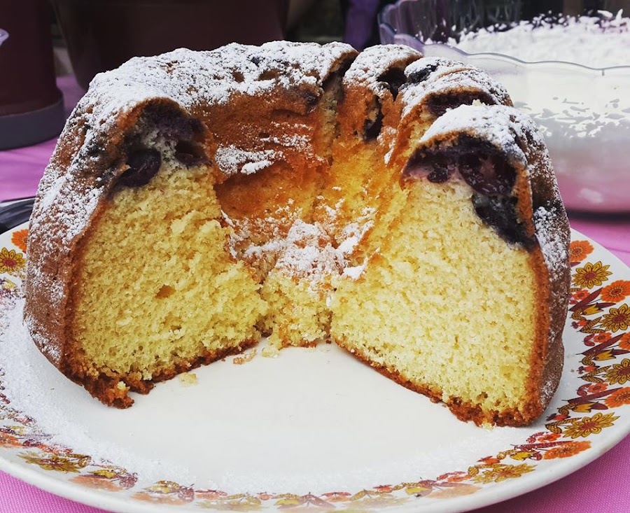 Enmantecá y enhariná un molde para budín. Pone en el fondo los arándanos y volcá por arriba la mezcla.
