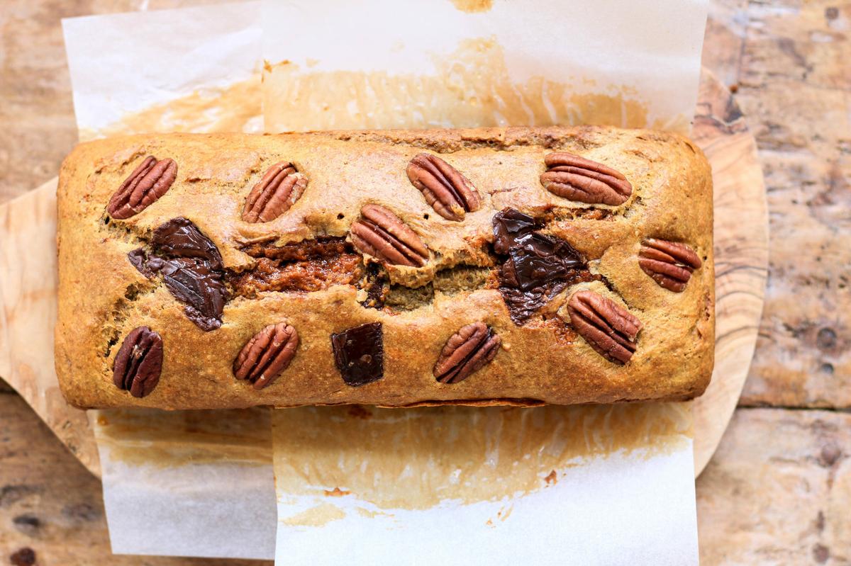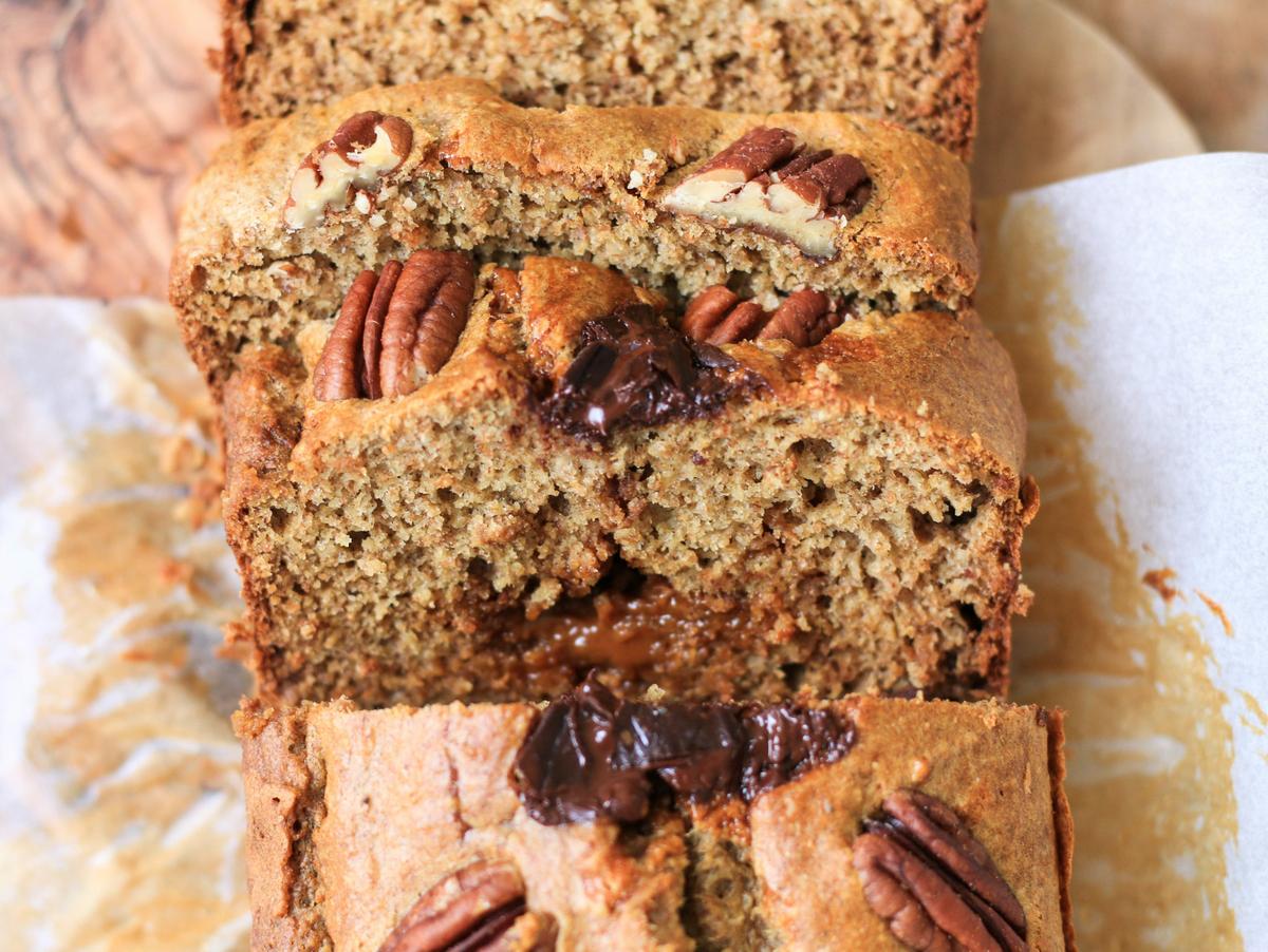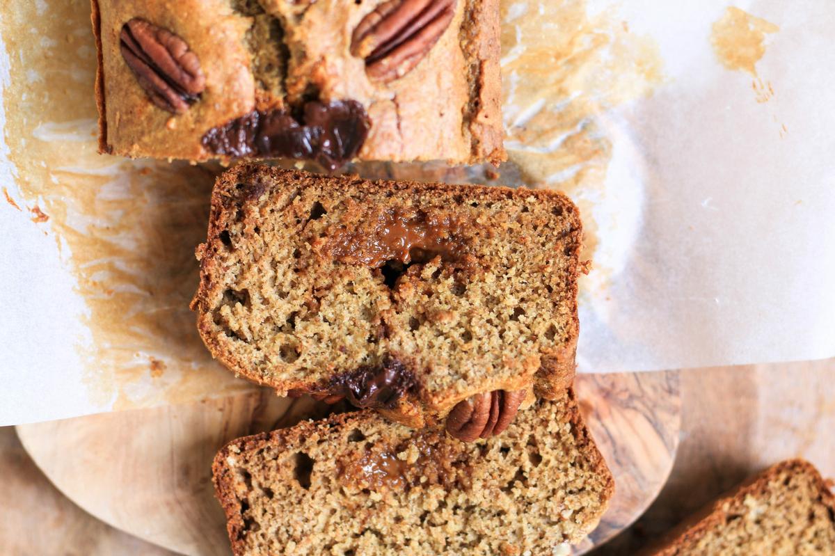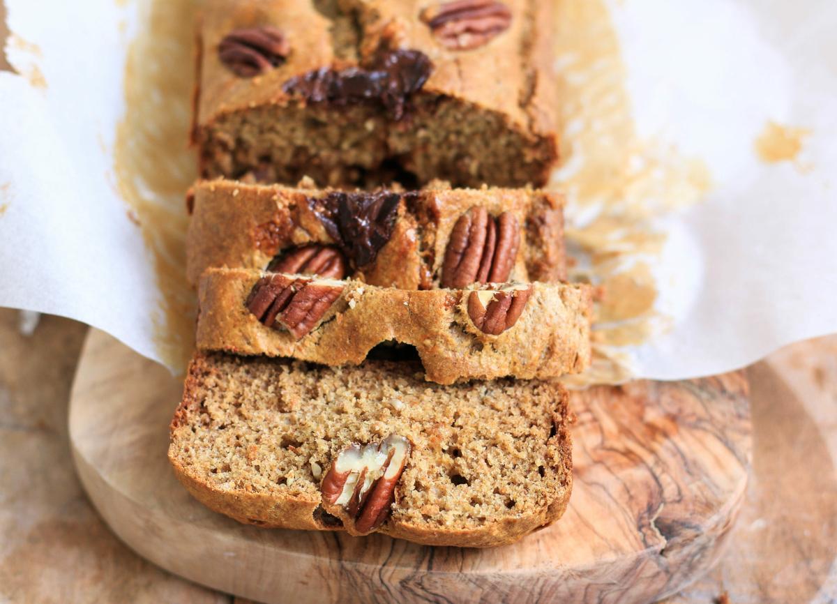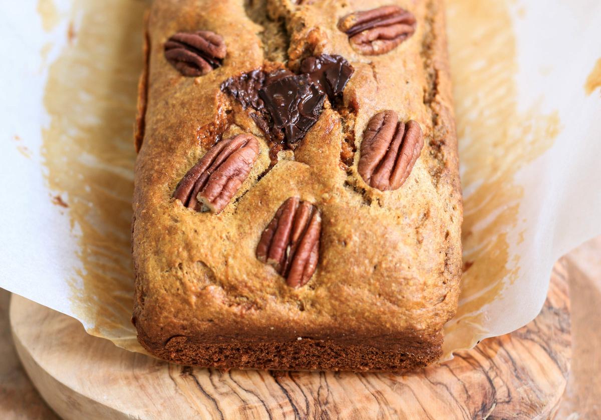 Budín de banana split hecho con harina integral y naturalmente endulzado. Otra receta genial para aprovechar las bananas que tenemos en casa.