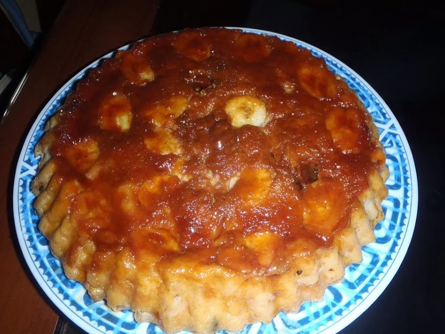 Para el caramelo: ponga a derretir el dulce de panela en una cacerola a fuego medio, cuando ya esté derretido no lo deje oscurecer solo que se derrita, coloque en su molde para hornear y agregue rodajas de banano a todo el molde. Luego agregue su mezcla de pan y hornee por 25 minutos aproximadamente a 260o, este budín queda muy suavecito. y es a fuego suave para que quede hidratado, si lo cocina a fuego alto puede quedarle muy seco.