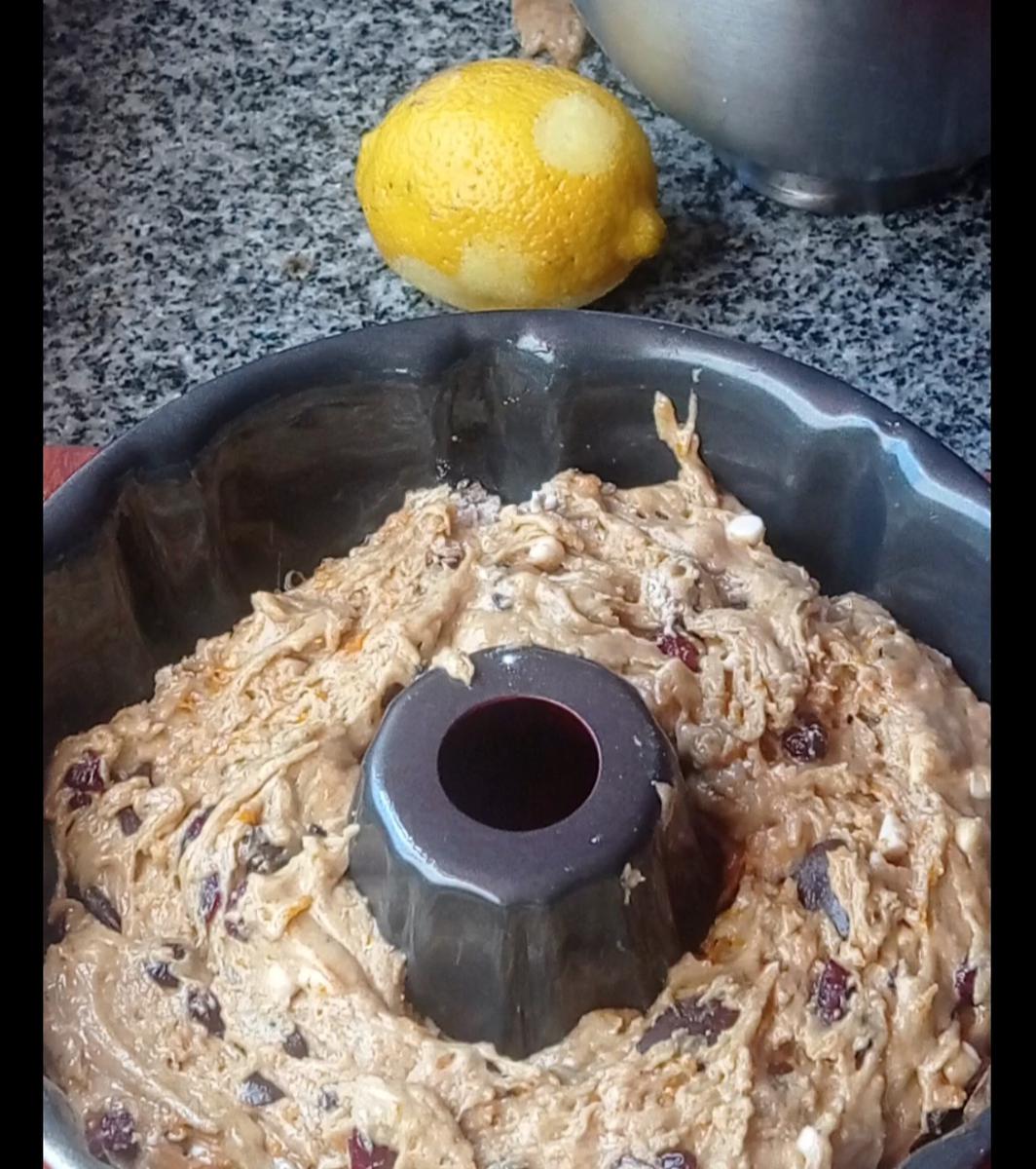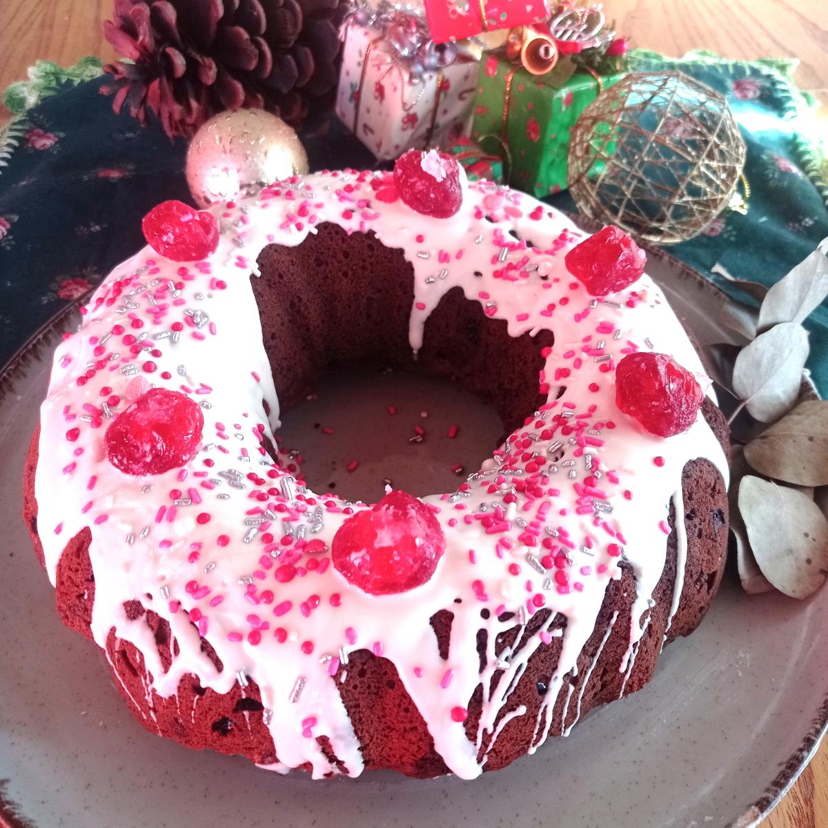Derretir un poco de chocolate blanco cada 10 segundos en el microondas hasta que se derrita y bañar el budín cuando esté frío, decorar con cerezas y granas rojas.