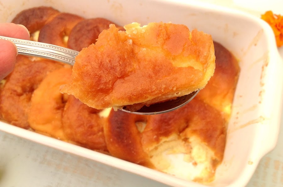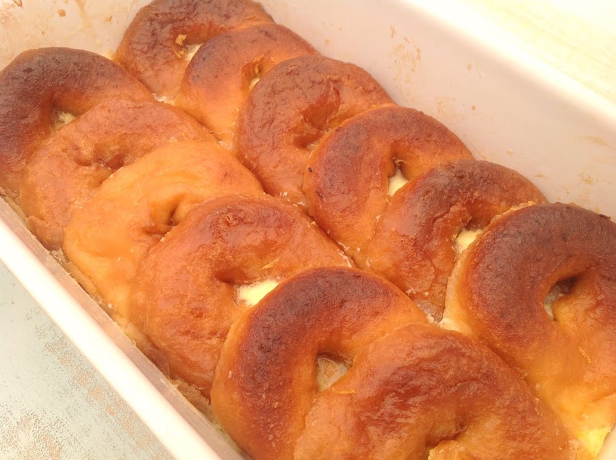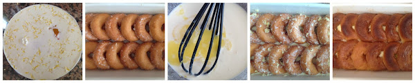 Pensando qué podía hacer con estos ingredientes me acordé de este budín de pan y mantequilla que preparé hace mucho tiempo y la verdad es que fue una elección fabulosa porque queda un budín riquísimo, de esos de repetir más de una vez.Los donuts los dejé secar durante dos días y fue la parte más difícil de la preparación, porque en la cocina había un aroma irresistible y el cachorro preguntaba: ¿Los vas a usar todos????