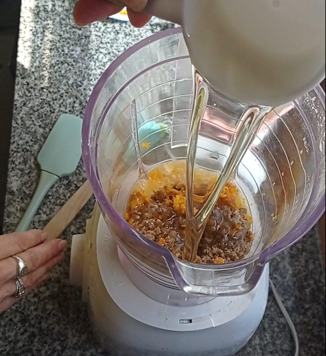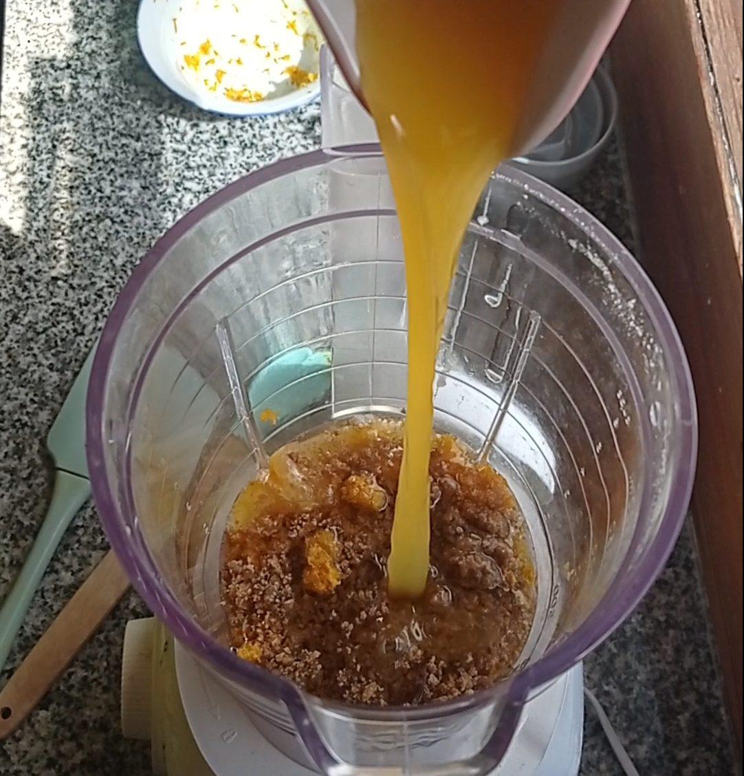 Licuar o mezclar los huevos, el azúcar, la ralladura, el jugo de naranja, y el aceite.