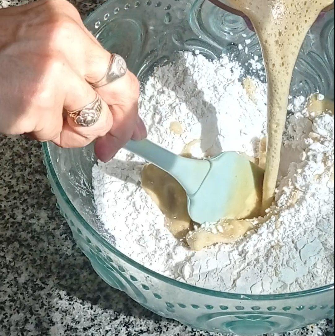 Volcar esta mezcla líquida sobre premezcla tamizada con el polvo para hornear, integrar bien