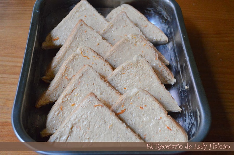 Coloca el pan en la bandeja que engrasaste, intercalándolas y con la parte de la mantequilla hacia arriba. Reserva.