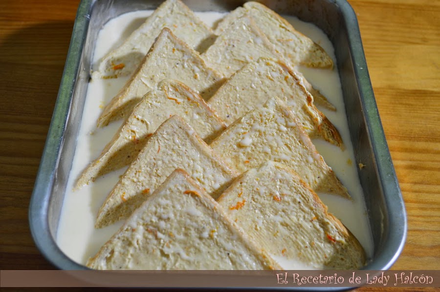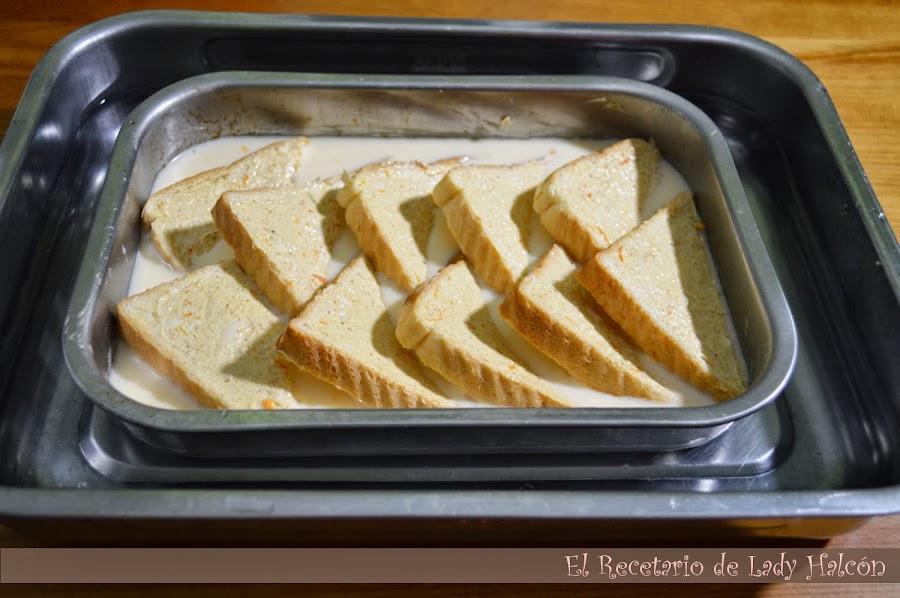 Coloca la bandeja con el pan dentro de otra más grande y rellénala de agua para que el flan se haga al baño maría.