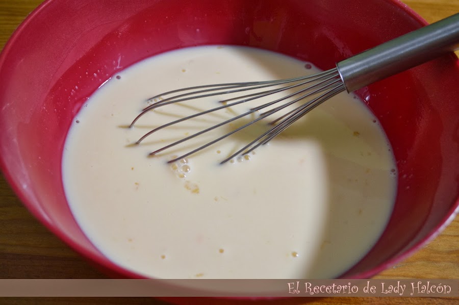 En un bol añade los 4 huevos, el azúcar glass, la leche la nata (crema de leche) y la vainilla. Remueve hasta que tengas una mezcla líquida, sin grumos y homogénea.