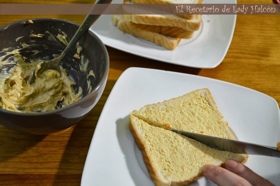 Vierte esta mezcla sobre las rebanadas de pan, cubriendo todos los huecos.