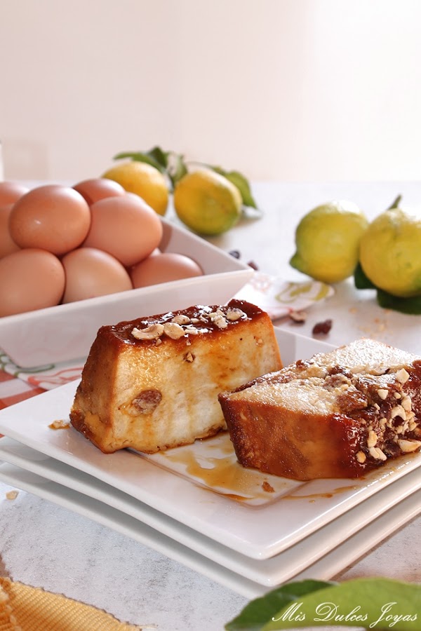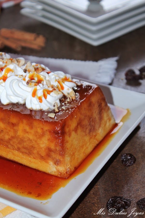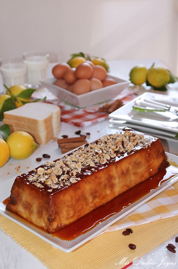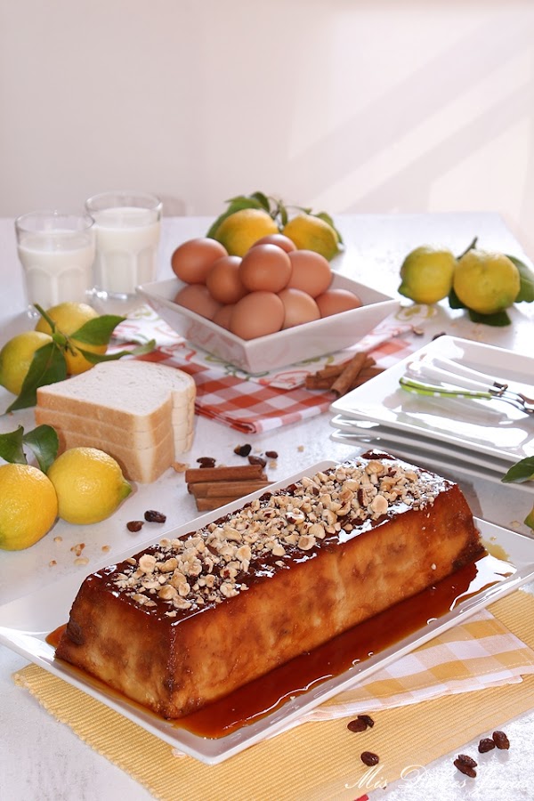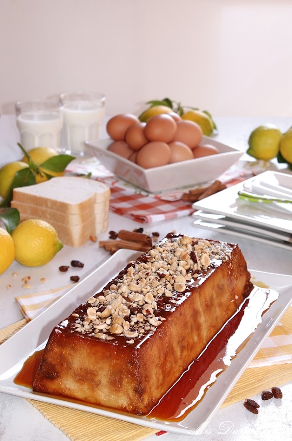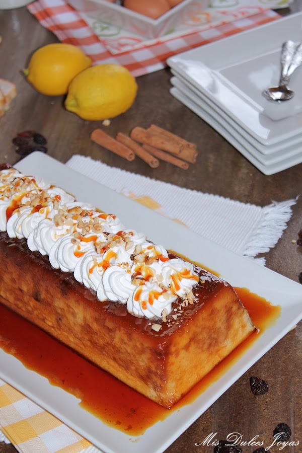 El pan es la base de este postre, pero su aglutinante es el huevo. Su textura es muy parecida al flan de huevo, pero un poco más firme. Se puede aromatizar con vainilla, ralladura de naranja, ó limón y canela en este caso. Yo le añado también Ron, que para mí sin el Ron este postre no tiene la misma gracia, así que bajo mi punto de vista, este es otro ingrediente imprescindible en la receta. En vez de uvas pasas, podemos añadir ciruelas pasas o dátiles, e incluso se le pueden añadir trocitos de manzana, de pera o frutos secos (nueces, pistachos o avellanas). Ya veis lo versátil que puede ser un postre tan sencillo y económico.
