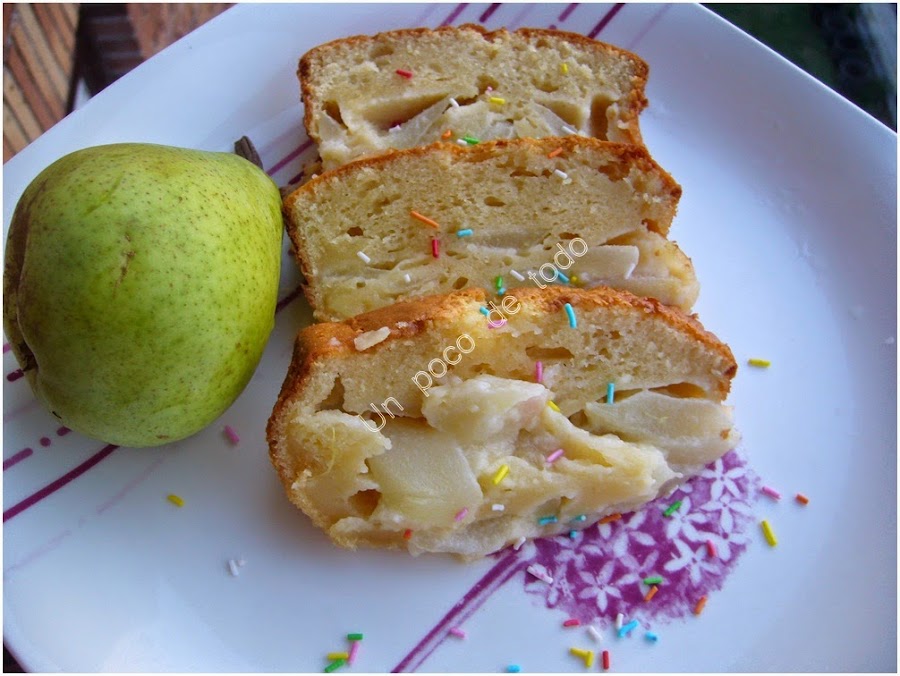 Batir todos los ingredientes y a continuación incorporar las peras en trozos delgados, meter al horno a 160º unos 45mn.