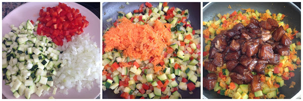 Ponemos el aceite en una sartén y allí sofreímos el calabacín, el pimiento y la cebolla troceados durante 4 minutos. Añadimos la zanahoria rallada y cocinamos 3 minutos más, a fuego medio y tapado. Incorporamos el salmón con salsa de soja, removemos y apagamos el fuego. Dejamos en la sartén tapada hasta que se temple un poco.