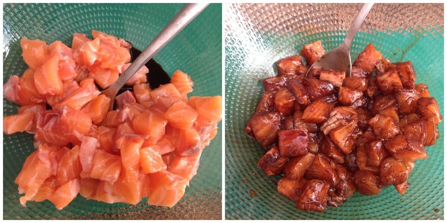 Limpiamos y troceamos el salmón y lo ponemos en un bol junto con la salsade soja. Removemos y dejamos macerar durante 20 minutos.